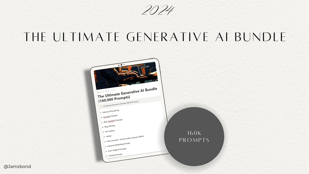 This comprehensive collection equips you with a staggering 160,000 prompts, designed to jumpstart your creativity and maximize the potential of leading generative AI models like ChatGPT, Bard, and Gemini.